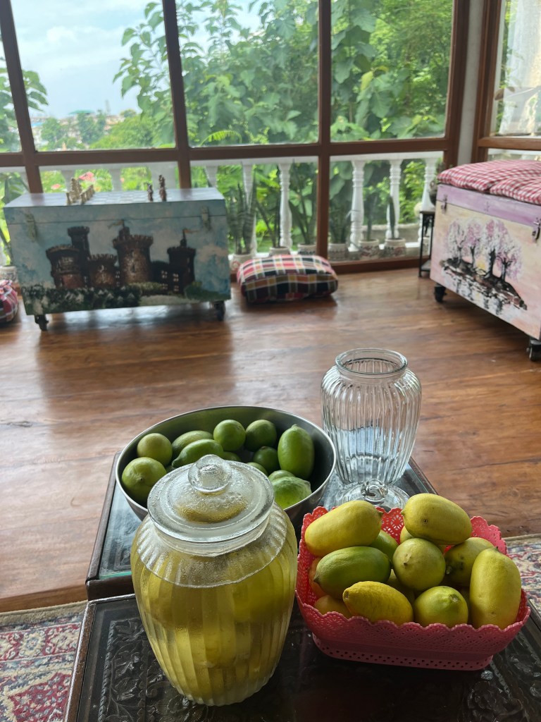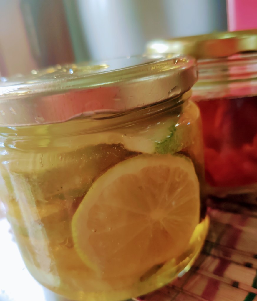 There are two methods I use to preserve lemons. In the first method, I bottle the lemons whole in a home made saline solution using pink Himalayan salt, leaving them in room temperature on my kitchen shelf for four/five days and then store in the refrigerator for winter use especially to flavour meat and fish dishes.